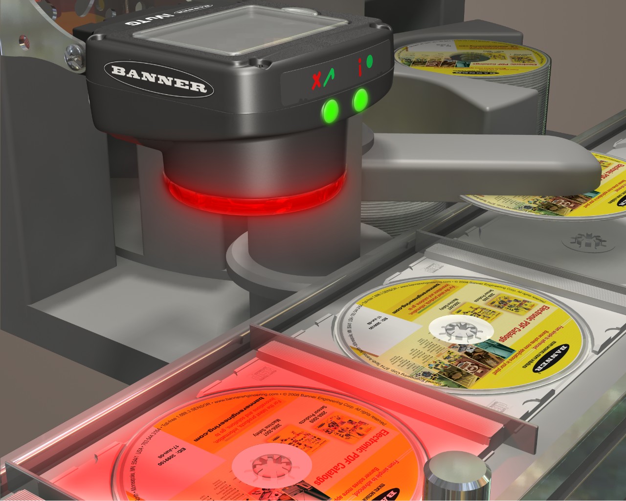 在音樂(lè)CD制造中,必須要確保每張音樂(lè)CD的方向都正確,然后才能將其裝入包裝盒內(nèi)。