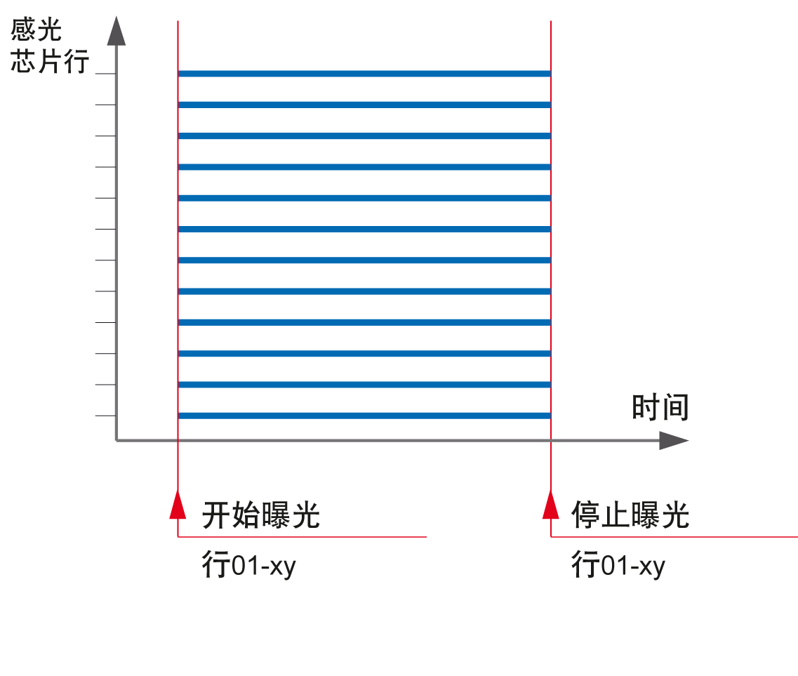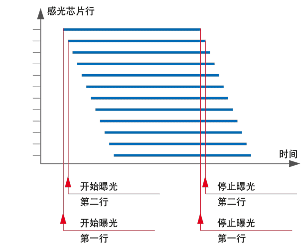 對于滾動快門,曝光時間不會同時開始和結(jié)束,而是按行分別進行: 圖解顯示了相片上各行的逐行曝光。