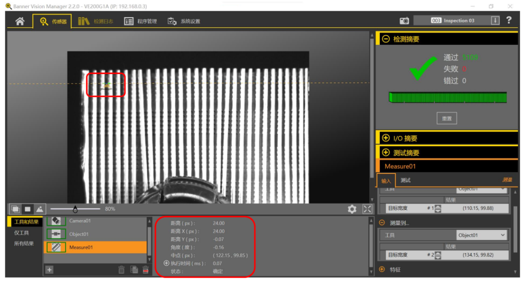 使用VE201G1A相機(jī)安裝在工件的正上方進(jìn)行檢測,安裝距離在400mm左右。