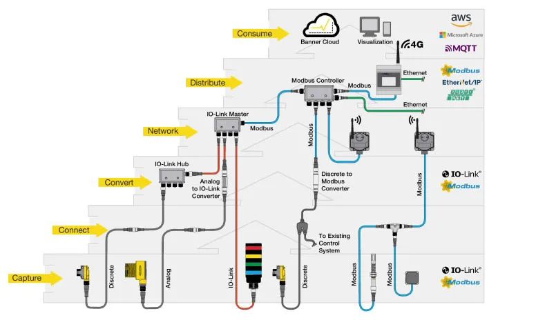利用邦納S15C和R45C轉(zhuǎn)換器釋放新老設(shè)備中的重要數(shù)據(jù)。通過這些轉(zhuǎn)換器可以連接兩種以前不兼容的設(shè)備類型,在多個IIoT生態(tài)系統(tǒng)中無縫傳輸數(shù)據(jù)。S15C和R45C轉(zhuǎn)換器接收各種類型的信號,包括離散、模擬以及其他信號,并將這些信號轉(zhuǎn)換為工業(yè)協(xié)議,如IO-Link或Modbus。這樣一來,它就很容易將現(xiàn)有的老式傳感器納入標準協(xié)議,從而實現(xiàn)過程監(jiān)控。