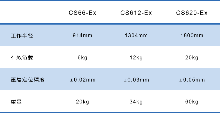 CS-Ex系列防爆協(xié)作機(jī)器人包括三款,負(fù)載分別為6kg、12kg、20kg,半徑分別為914mm、1304mm、1800mm,全面覆蓋主力市場區(qū)間,危險易爆環(huán)境得心應(yīng)手。
