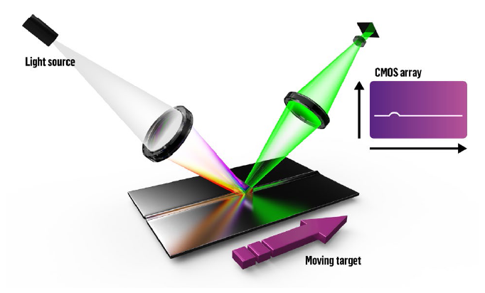 光譜共焦法:利用光學色散的基本原理,計算出距離和波長之間的關(guān)系,通過光譜儀解碼,便很容易得到目標物體的位置信息。對于一些特殊材料或復雜表面的檢測,具有較好的效果,比如檢測強吸光材料。